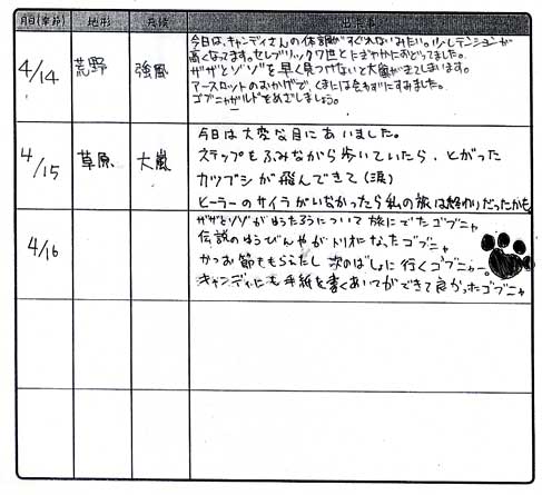 まず、小さな字で記入欄びっしりに書かれた旅日誌にビックリです! セッションが終わった後「こんなに書いていたのか~」と驚きました。3時間ちょっとしかセッション時間がないのに、この書きっぷりは見事! しかも書き手は1人ずつ交代しながらなので、皆さんがこれだけ頑張ったということですね。素晴らしい~。幻想風景の設定で、海賊と海軍は「伝説の食材 宝石魚・キングクラウンフィッシュ」を取り合っていることになったのですが、コックのリョウがまさかここまで反応していたとは(笑) セッションでも皆さんキャラクターが非常に立っていましたが、日誌の中でも自己主張がバッチリ。